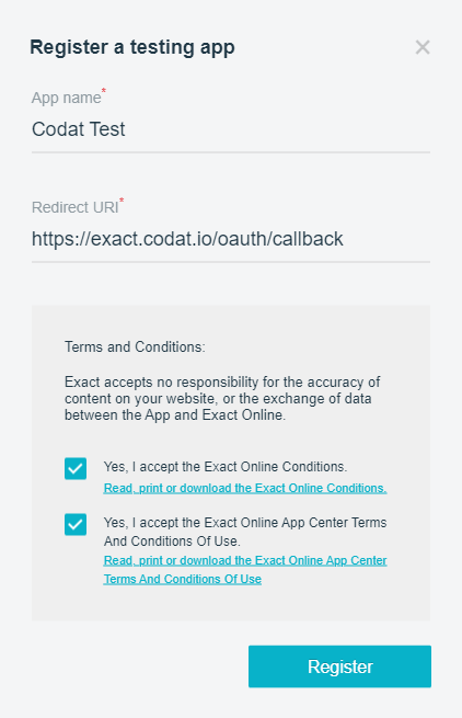 - Register a new application on Exact’s developer site.