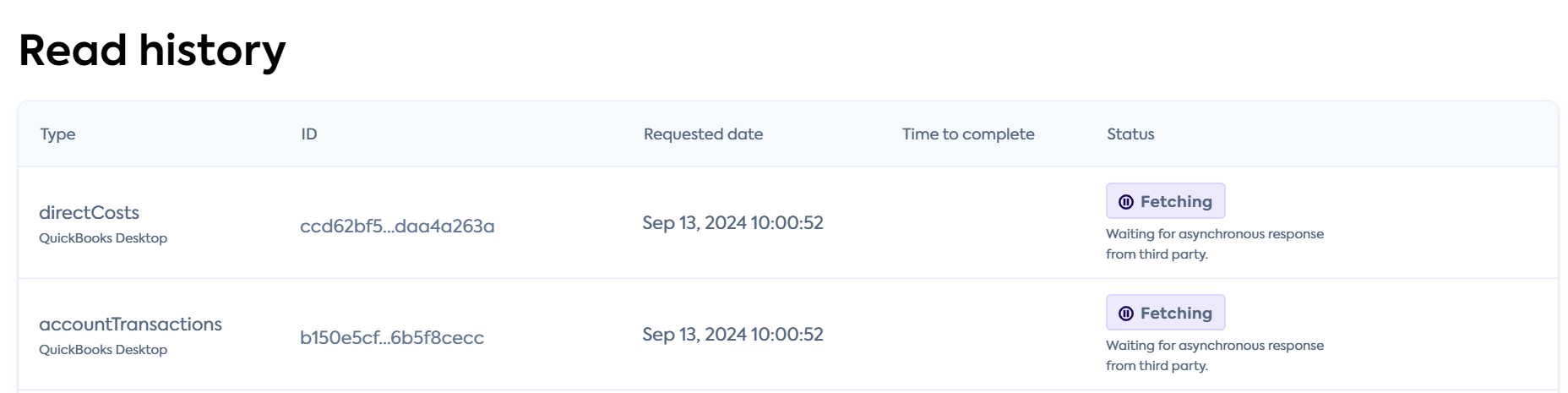 When a data type sync is listed as Fetching with the additional Waiting for asynchronous response from third party message, we try to surface the associated issue in Companies > Company > Data history of the Codat Portal and in the connectionInfo property of our Get connection endpoint.
