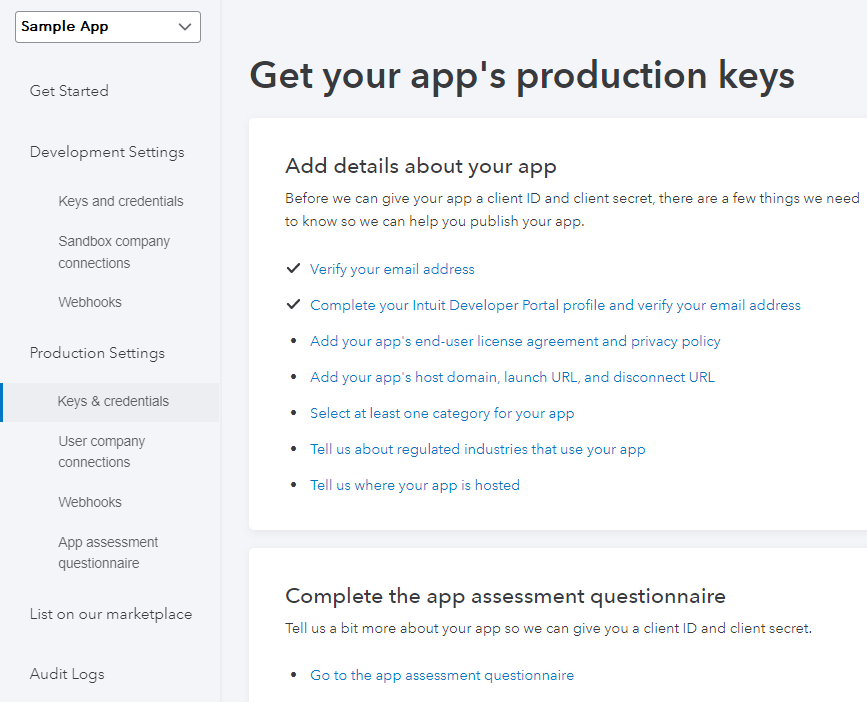Before you can access your app's production keys, you must complete an App Assessment Questionnaire. Intuit will review your answers to make sure your app meets their publishing requirements and guidelines.